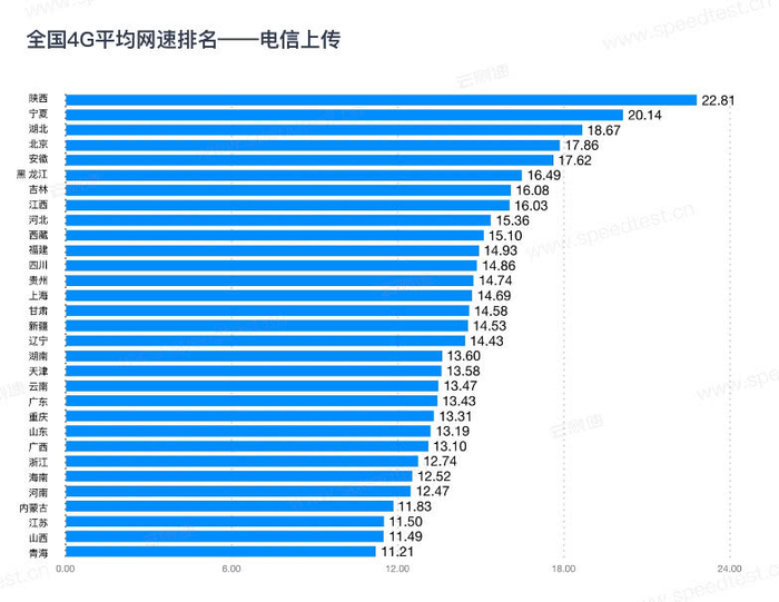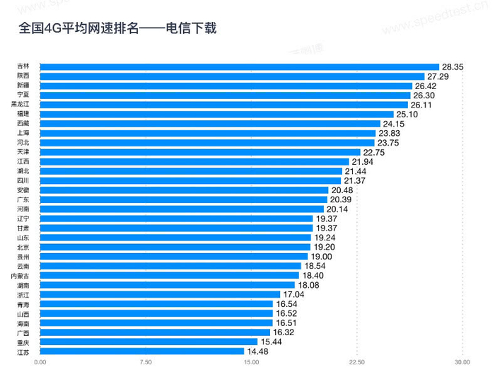 中国电信实测4G网速情况是:下载网速最快的是吉林,达到了28.35Mbps,陕西(27.29Mbps)和新疆(26.42Mbps)紧随其后。上传网速最快的是陕西,达到了22.81Mbps,宁夏(20.14Mbps)和湖北( 18.67Mbps)分列2,3名。