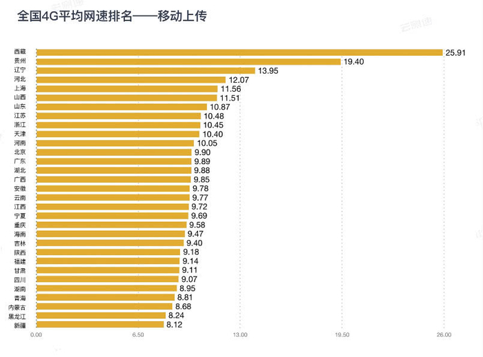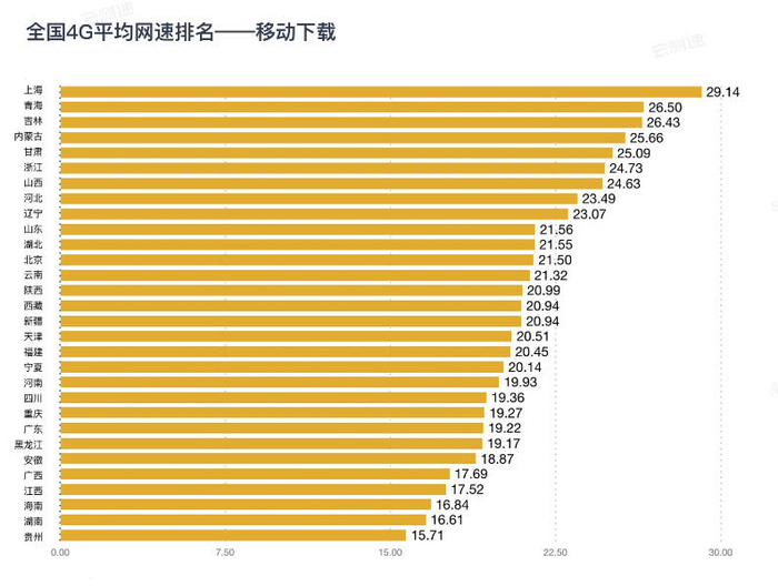 中国移动实测4G网速情况是:下载网速最快的是上海,达到了29.14Mbps,青海(26.50Mbps)和吉林(26.43Mbps)分列2,3名。上传网速最快的是西藏,达到了25.91Mbps,贵州(19.40Mbps)和辽宁(13.95Mbps)分列2,3名。