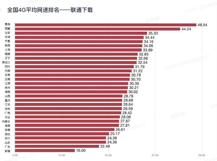 中国联通实测4G网速情况是:下载网速最快的是青海,达到了48.54Mbps,西藏和北京分别是44.24Mbps和35.33Mbps。上传网速最快的是青海,达到了26.90Mbps,天津和四川分别是23.91Mbps和21.84Mbps。