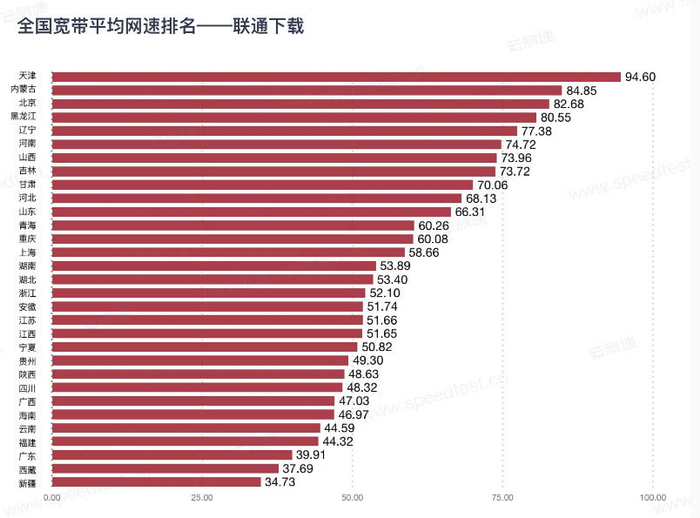中国联通宽带实测网速情况是:下载网速最快的是天津、内蒙古和北京,对应网速是94.60Mbps(11.8 MB/s)、84.85Mbps(10.6 MB/s)和82.68Mbps(10.3 MB/s)。上传网速最快的是甘肃、内蒙古和浙江,对应的网速是45.42Mbps(5.68 MB/s)、34.91Mbps(4.36 MB/s)、34.31Mbps(4.29 MB/s)。