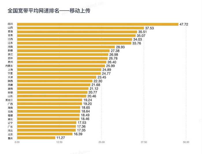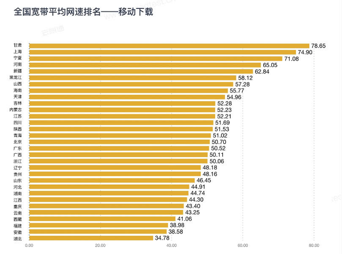 中国移动宽带实测网速情况是:下载网速最快的是甘肃、上海和宁夏,网速分别是78.65Mbps(9.83 MB/s)、74.90Mbps(9.36 MB/s)和71.08Mbps(8.89 MB/s),上传网速最快的是四川、山西和青海,对应的网速分别是47.72Mbps(5.97 MB/s)、37.53Mbps(4.69 MB/s)和35.51Mbps(4.44 MB/s)。