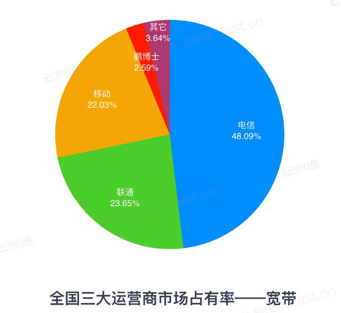 固网宽带上:2019年第一季度全国宽带网络市场占有率排名第一的是中国电信,达到48.09%;排名第二的是中国联通,为23.65%;排名第三的是中国移动,为22.03%。其它运营商为6.23%。