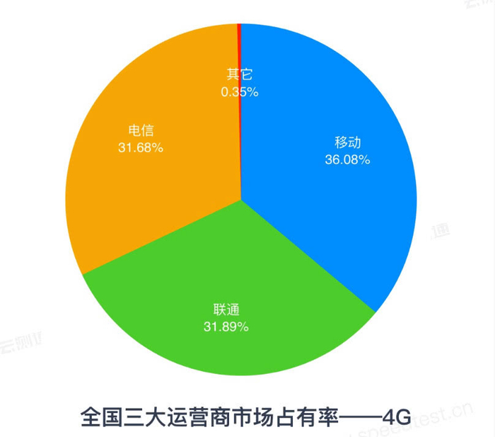 4G宽带上:2019年第一季度全国4G移动数据网络市场占有率排名第一的是中国移动,达到36.08%;排名第二的是中国联通,为31.89%;排名第三的是中国电信,为31.68%。其它运营商为0.35%。