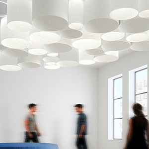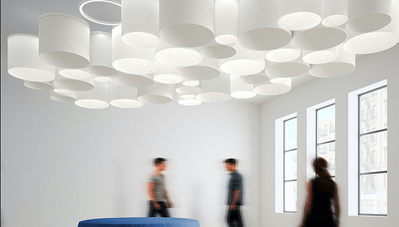 Ripple 是丹麦建筑事务所 BIG 与Artemide 的第二次合作,这是一个圆形吊灯系统,可以成簇排列,也可以在顶部添加附件,以扩散光线或产生声学阻力,目测将会成为办公照明的热门单品。