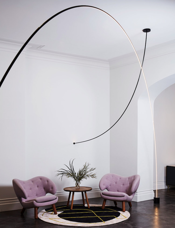 名为 Pole 的曲线造型灯通过同时联结墙壁、天花板和地面的造型使光线成为房间的中心,它由伦敦设计师 Philippe Malouin 设计完成,光线柔且能够产生迷人的光晕。