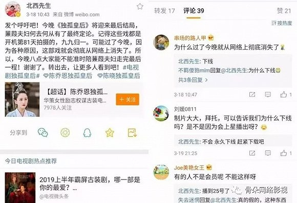 今年初,《孤独皇后》播出期间,微博认证为“华策影视执行制片人”的用户“北西先生”表示,《独孤皇后》播完后将永久下架,也不会上星播出,呼吁观众且看且珍惜。4月5日,完结不久的《独孤皇后》从三大视频平台下线,骨朵联系到华策方,对方表示,接到平台通知下线,但是“内容没有问题,平台会有自己的考量,可能跟今年倡导主旋律有关,不排除会再次上线。”