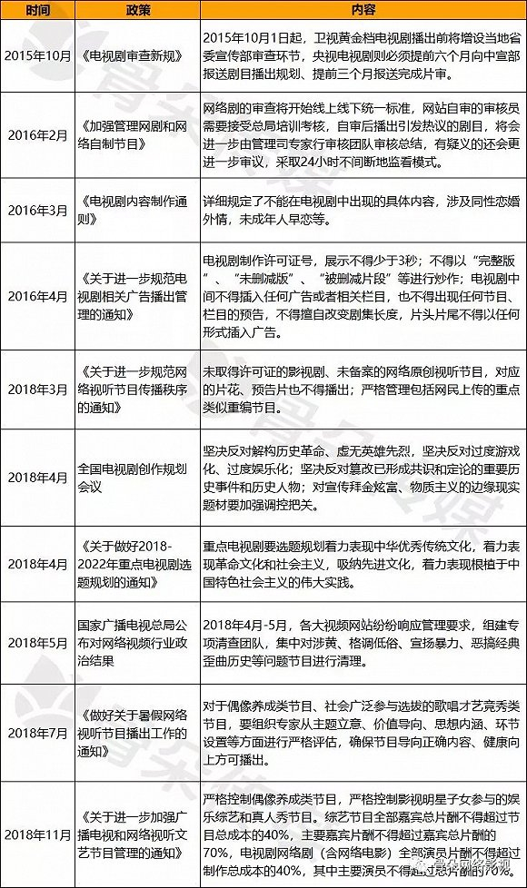 简而言之,2017年来的政策监管从内容监管、艺人薪酬、网络视听节目管理三大板块上不断收紧。