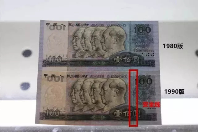 在1992年8月发行的1990年版壹佰圆元券和伍拾圆券中增加了公众防伪措施安全线,仰光透视为自上而下贯通的一条黑色全埋式安全线。