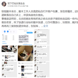 4月22日,据微博用户@双下巴仙女裴金金称,顺丰工作人员私自打开客户包裹,加她微信发信息骚扰,还把快递散落床上,佯装是他女朋友的物品。