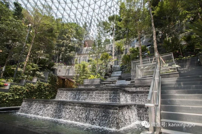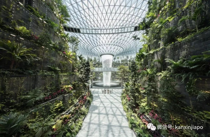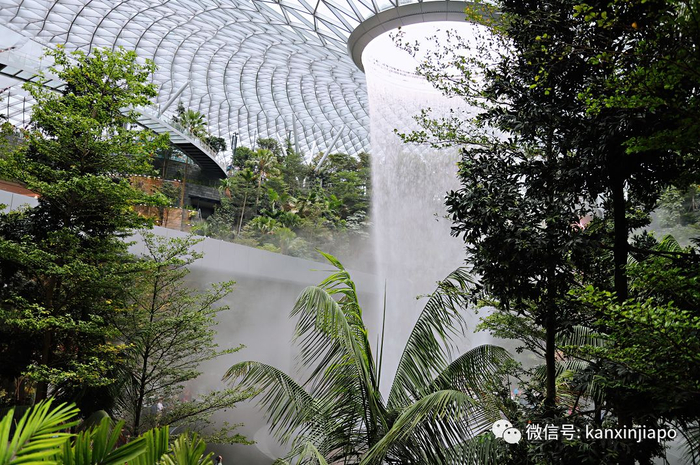 从天而降的瀑布,配合着由9000块玻璃,将近1万8000多个钢梁和6000多个钢节点组成的玻璃穹顶和沁人心脾的绿植……