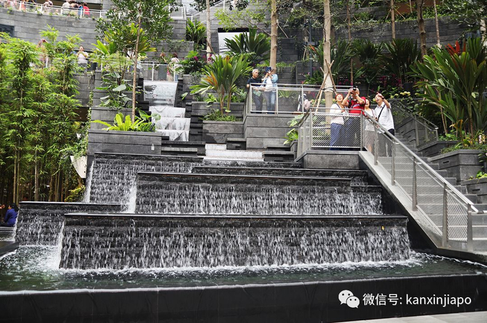 除了美得不可一世,星耀樟宜还尽显对来宾们的贴心:瀑布旁设有标识,提醒大家地上湿滑,走路小心。