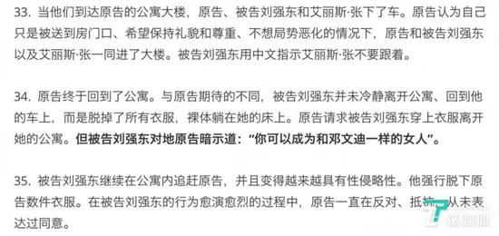 其次第二个环节,如果是“仙人跳”,从饭局离开后,应该是女孩精心策划了让刘强东送她回公寓的全过程,而不是刘强东主动要求送她。如前文所说,这从视频里并不能看出来到底谁要求。但是当晚的司机证人或能说明一二,目前女孩起诉书里提及了司机的证言见证了路上的一切(如截图)。但是刘强东没有提及司机证言,仅提及了他的助理证称是女方主动。