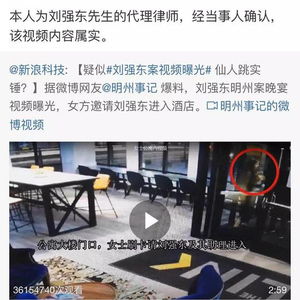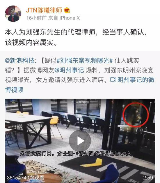 而刘强东代理律师陈曦律师通过个人微博账号转发视频内容称“经当事人确认,该视频内容属实”。
