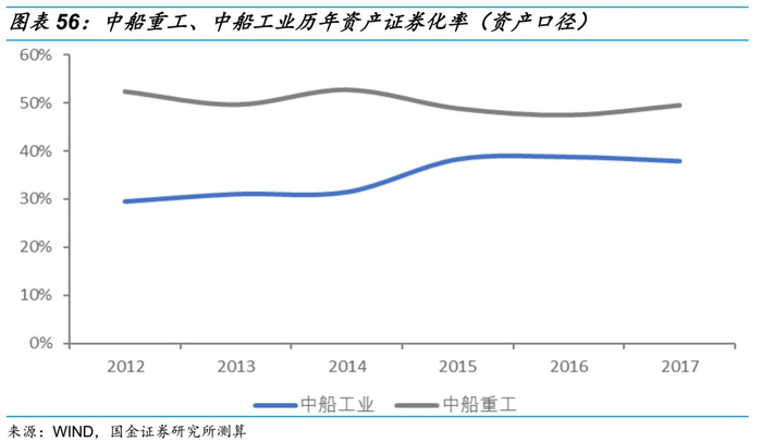 (2)资产运作方面,两大集团已分别形成船舶总装、动力系统等资本运作平台,资产证券率有所提升,以资产总额口径计算,北船资产证券化率近年来约为50%,南船资产证券化率从2012年的约29%提升至约38%,核心军品上市不断加快。