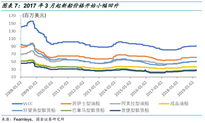 (4)船舶行业已进入触底阶段,撤单量降到近十年最低,同时新船价格略有回升。根据BRS报告数据,2017年至2018年,全球船舶撤单量降到4.4、5.9百万载重吨,是近十年最低水平;从各船型的撤单量来看,散装船占比最大(28艘,51%),油轮(31艘,23%)、集装箱船(24艘,15%)为第二、第三。同时,根据Fearnleys数据,2017年3月起,新船价格开始小幅回升。