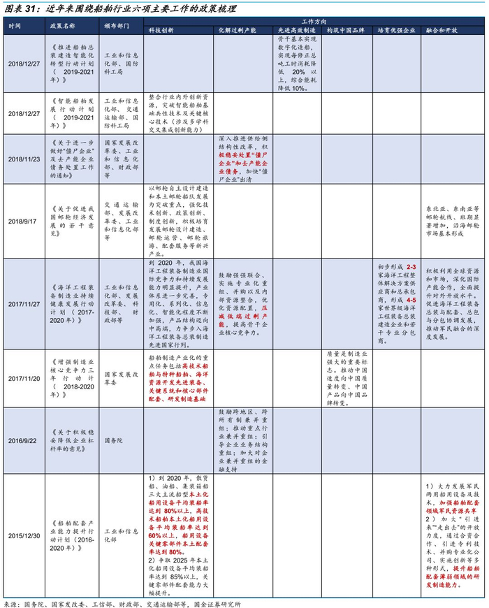 (2)2017年下半年以来,围绕船舶行业整合、发展的政策频频颁布,主要聚焦压减低端过剩产能、支持自主创新以及培育优强企业。我们认为,推动船舶工业结构性转型已从顶层设计走向加速落地,“十三五”后期有望迎来更多配套政策。