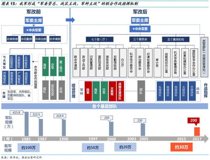 (1)2017年以来,军队改革屡见成果,包括军委职能部门及人事调整、解放军与陆军调整组建等等,目前军队体制已形成“军委管总、战区主战、军种主建”的格局,在部门调整、职能划分、联合指挥与精简高效上均已发生深刻变化。我们判断,随着军队改革进入收入阶段,叠加新体制格局对装备更新需求增加,核心装备采购有望回暖。