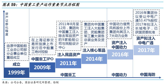 (1)中国重工于2014年注入舰船总装业务。2009年,集团旗下中国重工在上交所挂牌上市,此后进行了两次大的资本运作——2011年8月至12月,集团向中国重工注入除去军品资产的9家船舶公司与民船设计中心,此次注入资产以民品为主;2014年4月,集团向中国重工注入大船集团、武船集团的军工重大装备总装业务及资产。