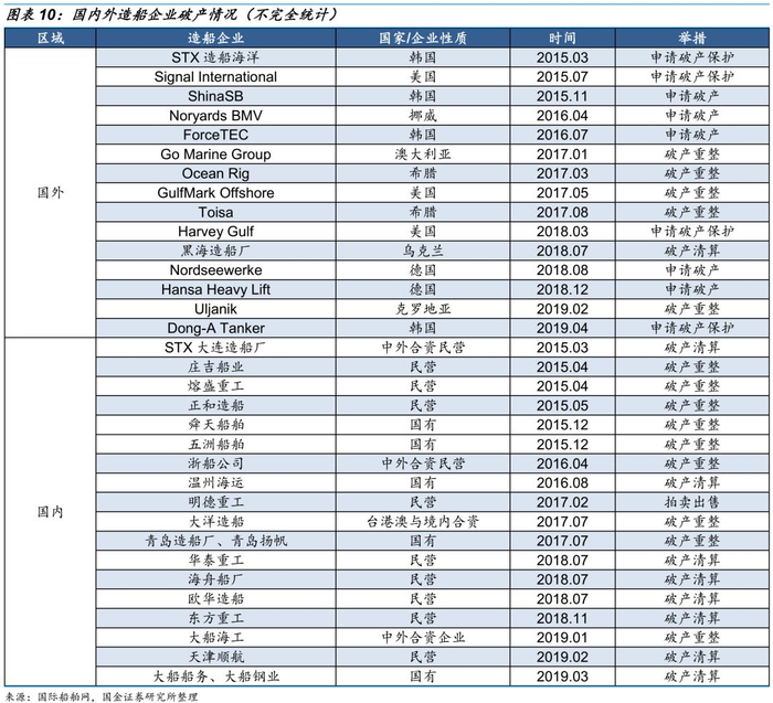 (2)部分船厂生产连续性无保障,造船产能预计进一步缩减。2019、2010年计划交付的新船规模分别仅为1.04亿载重吨和0.79亿载重吨[1],一些中小型船厂近年来接单相对困难,生产连续性已无从保障,预计全球造船完工量将会缩减、集中度将进一步提升。截至2019年3月,韩国、中国、美国、德国等国的部分造船厂资金链断裂、走向破产。