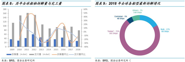 (1)我们看到,过去10年,大多数年份的旧船拆解速度大于新船建造速度,过剩运力加速去化。根据BRS最近发布的《航运及造船市场(2019)》,2018年全球船舶拆解量为2760万载重吨,同比-13%,大于交付量的同比-18%;从各船型看,化学品船拆解量占比72%、181艘,散货船占比17%、60艘,集装箱船占比5%、48艘,其他船种占比7%、148艘。此外,即将出台的有关压载水的规章制度处理系统(BWTS)和硫排放上限(2020年)可能会使船舶拆解加速。
