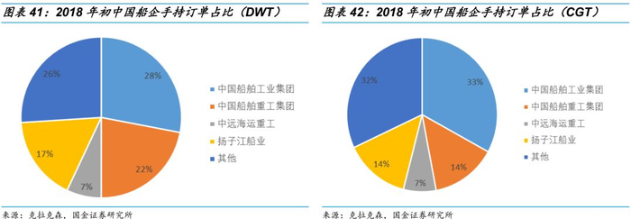 (2)我国主要有四大骨干造船集团,分别是中船工业集团、中船重工集团、中远海运重工与扬子江船业,合计全国市占率达90%以上。根据克拉克森数据,2018年初,以手持订单的修正总吨计算,四大骨干船企合计国内市占率达93%;2018年上半年,扬子江船业、外高桥造船、新时代造船、广船国际南沙以及沪东中华列席国内造船厂手持订单量排名前五。