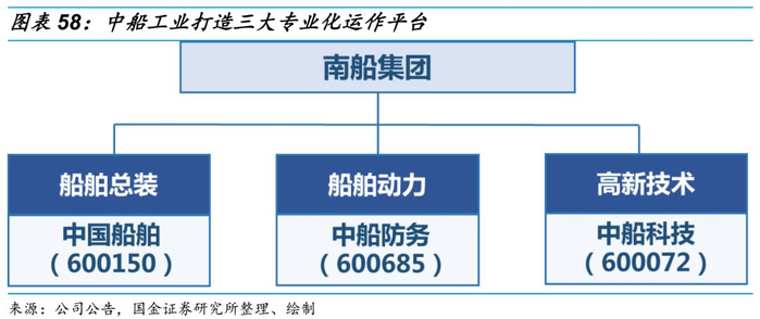 (2)本次资产重组标的具体可分为整船制造、船舶修建、动力装置设计与制造,共涉及4大造船厂,1个船舶造修以及4个动力装置与制造公司及研究院,其中,中国历史最悠久的军舰制造厂江南造船拟注入中国船舶是最大看点。我们看到,中国船舶将定位船舶总装平台,拟注入整船制造与船舶修建资产,业务涵盖军、民品,类似于北船旗下的中国重工;中船防务将定位为船舶动力平台,拟注入动力装置设计与制造资产,类似于北船旗下的中国动力。