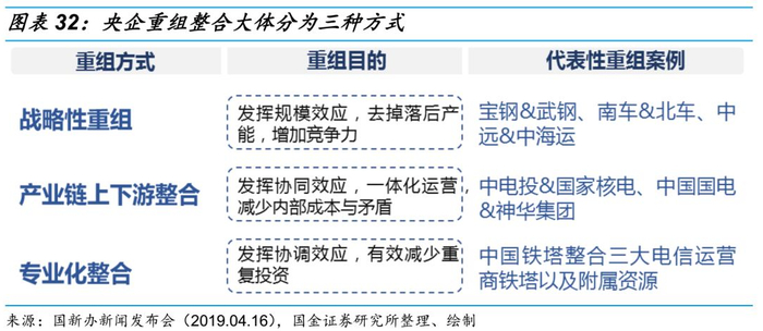 (1)重组整合方式主要包括战略性重组、产业链上下游整合以及专业化整合。根据国资委彭华岗在4月16日国新办新闻发布会上的讲话,近几年重组的方式大体为三种,具体包括战略性重组、产业链上下游整合及专业化,目的是通过去掉落后产能、一体化运营及减少重复投资以更好地发挥规模效应、协同效益,提升综合竞争力。