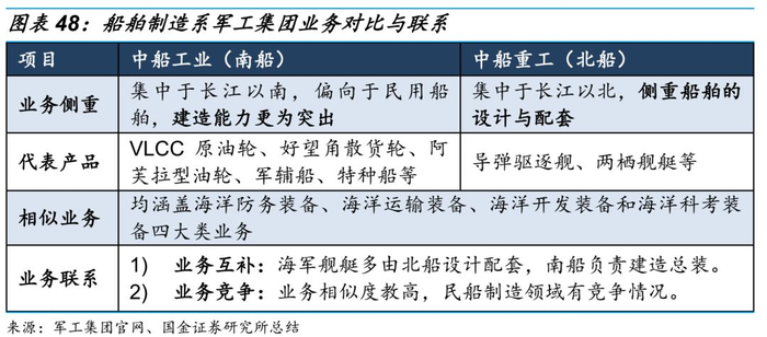 南北船是1999年国企改革背景下由中国船舶工业总公司拆分而来,两船本是同根同源,在民船制造领域上是竞争关系;在军船领域上协同,其中北船侧重船舶设计与配套,南船承担更多军舰制造任务。