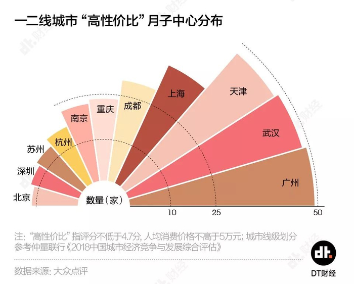 DT君进一步将人均5万元以下,评分4.7分以上的“高性价比”月子中心筛选出来,发现广州、天津和武汉的宝妈们坐月子最为幸福,大约有50家左右可供选择,北深苏杭相对较少,只有大约十来家。
