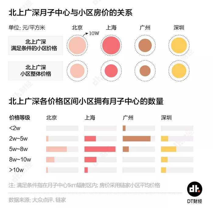 就拿一线城市来说,DT君通过对比月子中心周围1km内小区的房价情况,发现其范围之内的小区单价中位数比全城至少高出50%(除了深圳,高出20%),上海的差距则达到了一倍。TA简直是买房时的指路明灯:如果囊中羞涩,勉强能在上海买房,自动避开附近有月子中心的小区就行。