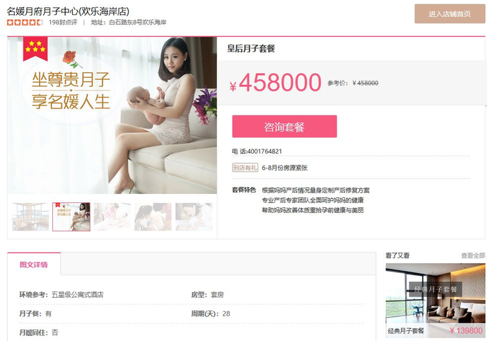 标语“坐尊贵月子,享名媛人生”,仿佛在告诉你,只要坐了这样的月子,就真的成为名媛了。可是摸摸自己的口袋,才发现潜台词是“只有名媛才有资格享受这样的月子”。