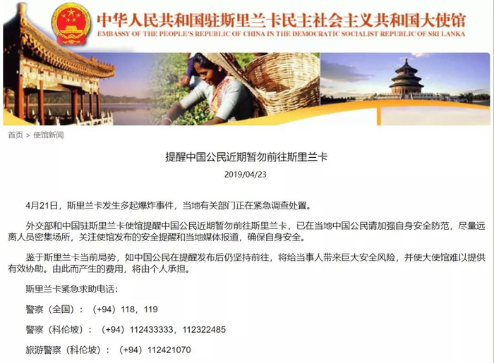 4月23日,中国驻斯里兰卡大使馆也发出提醒中国公民近期暂勿前往斯里兰卡。