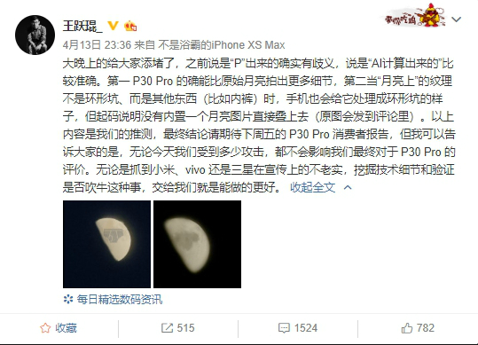 从4月13日19:03到4月13日21:26,自媒体爱否科技前主笔王跃琨连发四条微博质疑华为P30 Pro拍月亮功能,