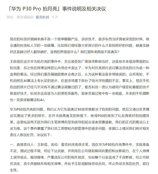 之后,爱否科技官方发出《“华为P30 Pro拍月亮”事件说明及相关决议》,王跃琨被“解除劳动合同”。