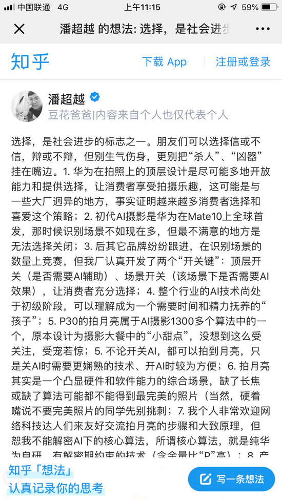 关于对华为P30 Pro“拍月亮事件”的看法,华为消费者业务BG相关人士对记者表示,可以参考知乎用户“潘超越”发表的《选择,是社会进步的标志之一》,该文章内容显示,华为P30 Pro拍月亮功能属于AI摄影1300多个算法中的一个;无论开关AI,都可以拍到月亮,只是关AI时需要更娴熟的技术、开AI时较为方便。