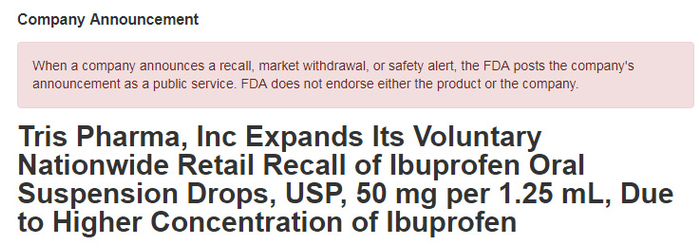 公告称,美国Tris制药公司的一款布洛芬口服混悬滴剂,部分批次可能含有较高浓度、超过规定标准10%的布洛芬,于是自愿在全国范围内召回6个批次的药品。