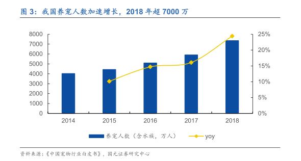 宠物数量和宠物消费增长效应叠加导致市场规模的高速增长。2014年以来,我国养宠人数持续增长,五年复合增速16%,年增速不断加快。2018年中国城镇养宠人数7355万人,同比增幅超24%。其中城镇养猫狗人数达5648万人,占比77%;宠物猫狗数量也由2017年的8746万只增长到9149万只,同比增长4.6%。