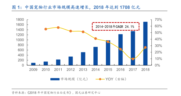 1.1 宠物数量与消费增长效应叠加,国内宠物市场快速扩张国内宠物行业市场快速发展壮大,五年规模翻1.5倍。《2018年中国宠物行业白皮书》数据显示,我国宠物行业市场规模已经达到1708亿元,同比增长约27.5%。其中宠物狗市场规模约为1056亿元,宠物猫市场652亿元。2014年~2018年五年内市场规模翻了1.5倍多,年复合增速24.1%。