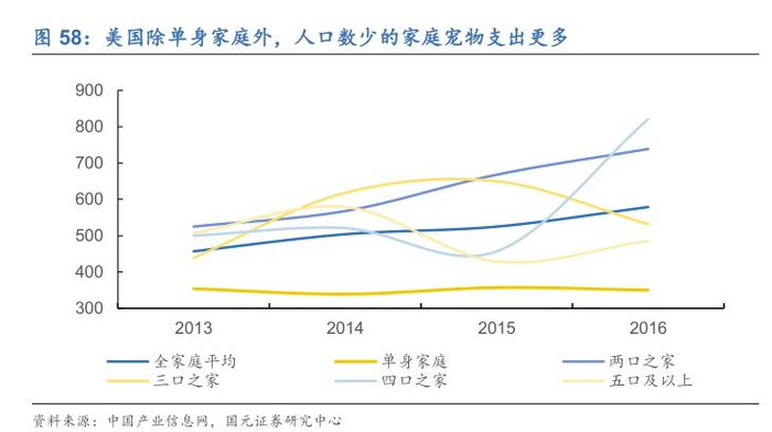 社会发展带来宠物需求。从发达国家的经验来看,老龄化、少子化和晚婚晚育等人口和家庭的结构变化似乎是经济发展和社会进步中的必经之路,越来越多的空巢老人、空巢青年、丁克家庭等出现。但与此同时人们也面临着孤独感加深和被需要、安全感缺失等情感问题,宠物的陪伴互动、对宠物主的忠诚依赖使得宠物与宠物主之间形成一种亲密关系,一定程度上满足宠物主的情感需求。美国家庭宠物消费数据显示,家庭人口数量与相应的宠物费用支出有一定的负相关关系,家庭人口多的宠物支出相对较少。很显然当家庭人口数量较多时,家庭成员之间的陪伴降低了人们对宠物陪伴的需求。饲养宠物的数量下降,随之对宠物支出费用也会下降。