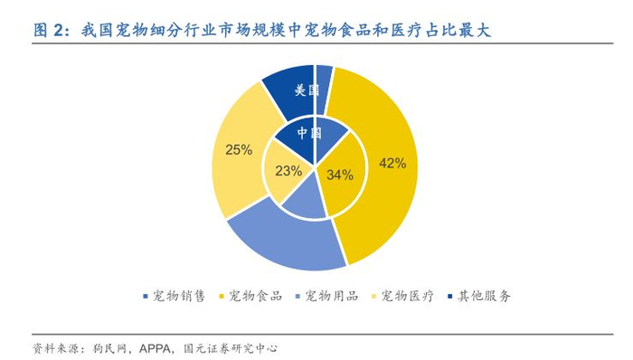 宠物食品和医疗是规模占比最大的两个细分行业。随着国内宠物行业的发展,宠物产业链在逐步完善,各细分行业因为产品或服务的必需性不同市场规模也有明显差距。从细分行业结构来看,宠物食品和宠物医疗规模占比最大,分别为34.8%和23.0%。对标美国的情况,预计这两个细分行业规模占比未来还将继续增加。