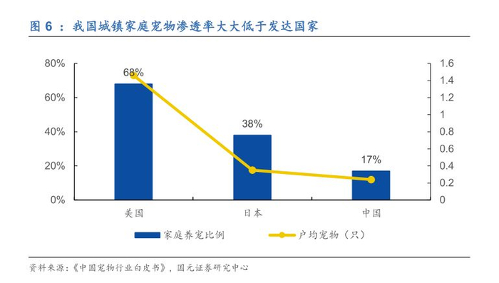 我国整体宠物的家庭渗透率低,城镇人口是养宠主力
