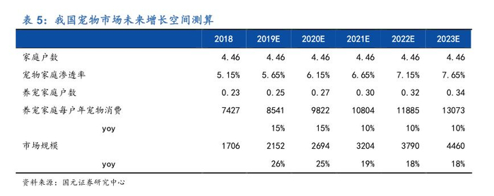 3)每户宠物消费。中国宠物白皮书显示,2017年户均宠物消费为6436元,而2018年为7427元,增加约15%。目前我国宠物行业还处于高速增长阶段,因此我们假设未来两年户均宠物消费会继续保持15%的增速水平,两年后下降至10%。