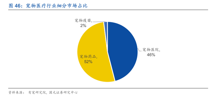 宠物医疗主要包括医院、药品以及疫苗三部分,根据2016年中国宠白皮书统计,宠物医院占比约为46%,而宠物药品占比约为52%,宠物疫苗占比为2%。