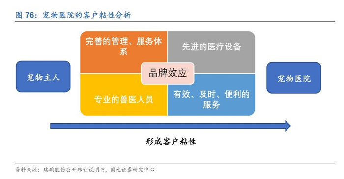 连锁化率提升是必然趋势。大型连锁化医院凭借其资金实力具有管理规范、兽医专业度高、设备先进等多方面优势并可以通过技术、设备、人才上的资源共享,建立有效的医疗网络系统,有效解决宠物主的需求痛点,提升客户粘性。从而在客户认知范围内凭借专业性和便利性树立品牌效应,逐步扩大市场份额形成规模化经营,有效降低运营成本。