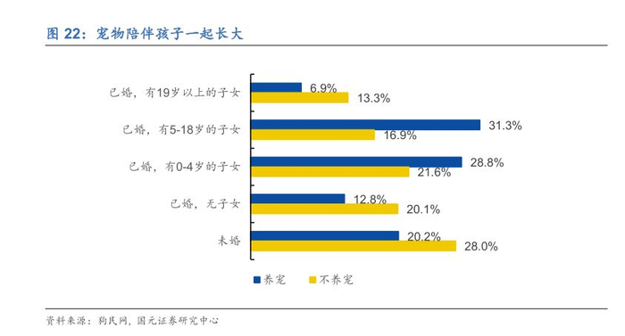 从学历上看,养宠人群本科及以上的比例达到58.4%,大专及以上的比例88.4%,养宠以高学历人群居多;在养宠人群的职业分布中,企业普通职员占比最大,为29.8%,年轻白领成为养宠主力;普通白领往往更加年轻,有一定的经济能力和时间,独居的比例更高,对养宠更有热情。从养宠用户的婚姻情况看,已婚占比要大于未婚,且已婚有小孩的家庭占比更高。未婚人群养宠可能会受到住房、经济等因素的影响无法养宠,而有小孩的家庭的养宠观念逐渐改变,宠物的情感性角色凸显,宠物可以成为孩子成长过程中很好的玩伴,特别是独生子女家庭,让宠物和孩子一起成长对孩子的身心健康都有很大益处。
