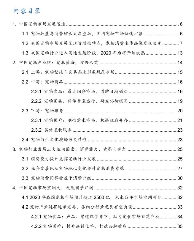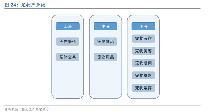 作为当代人精神寄托的重要载体之一,宠物的地位正在悄然发生变化。宠物饲养已经从原先的简单粗放逐渐向品质化、精细化转变,并由此衍生出一条完整的宠物产业链,基本包含了宠物从出生到死亡过程中的各个环节。其中,上游包括宠物繁殖及交易;中游主要为宠物商品,包括食品、日常用品;下游为宠物服务,包括宠物医疗、宠物美容以及宠物培训等。
