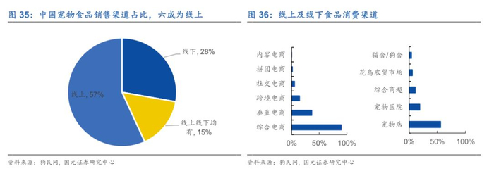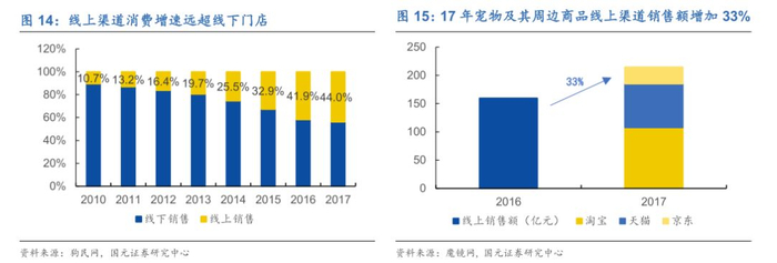 线上渠道成为宠食消费主流,为品牌竞争提供平台。根据狗民网统计表明,目前我国有近六成的宠物主人选择在线上平台购买宠物食品。线上方式中以综合电商比例最高,达到90%,垂直电商排在第二位,占比为37%。在国外线下宠物店的通常是宠主的消费首选渠道,美国宠物服务巨头PetSmart就采取了线下连锁店+线上电商的模式。但是在中国宠物线下零售业与服务业尚未发展完全时电商平台已迅猛崛起,并迅速分流了大部分客户群体。电商平台削弱了线下连锁经营店自身的品牌优势,拓展了用户的选择范围。对于原有主导品牌需要借助互联网进一步提升宠物主人对品牌认知度,而新品牌可以通过线上渠道的营销快速抢占市场。