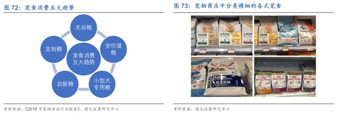 根据CBNData《宠物食品行业趋势报告》显示,无谷粮、全价湿粮、定制粮、功能粮、小型犬专用粮是宠粮消费的五大趋势,能够满足不同成长阶段、品种、体型和健康需求的细分宠粮销售份额快速增长,各大宠物食品企业也不断开发新的宠粮类型以占据市场份额。