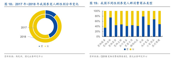 宠物白皮书数据显示,猫狗宠物主中女性人数占比为88%,显著高于男性。而2017年女性宠物主占比为55.7%,仅略高于男性。可见女性养宠数量正在迅速增长。此外,相对于男性,女性消费者对于宠物的照料也更加细心,更关注宠物的饮食、娱乐和健康,且偏好于“颜值消费”。无论是打造自己的爱宠,还是可爱的宠物用品,她们都无法抗拒。而男性消费者更注重实用性,且比女性更偏爱容易照料的水族宠物,因此在水族和小宠用品方面的消费占据主导地位。