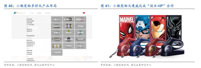 国内具有自主研发水平,能够生产智能宠物产品的企业较少,目前行业内具有代表性的企业是小佩宠物。公司成立于于2013年8月成立,产品由最初的智能穿戴设备到现在多线布局,涉及宠物的饮食、出行及清洁各个方面。天猫旗舰店显示小佩宠物智能饮水机的销量已超过了15万台。在今年3月的新品发布会上,小佩宣布与漫威达成深度合作,推出了不同英雄版牵引绳。借助爆款IP为新产品推广造势,符合公司聚焦于年轻的消费群体的定位。